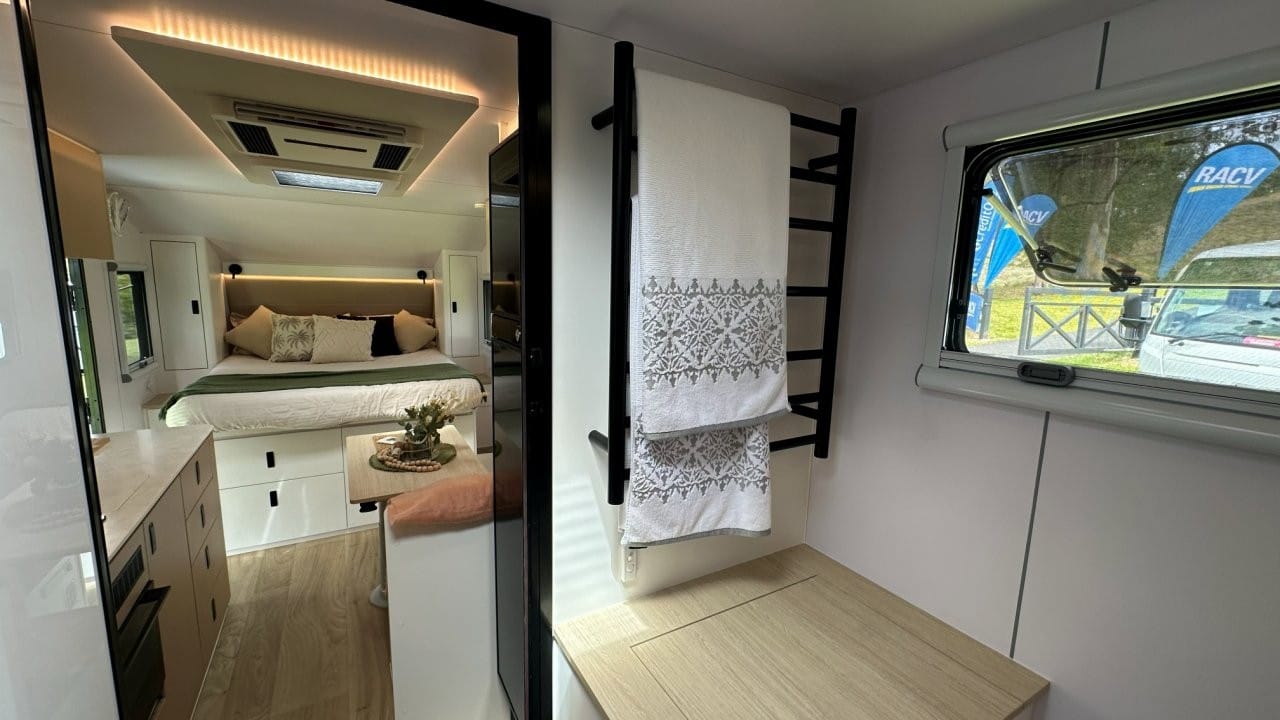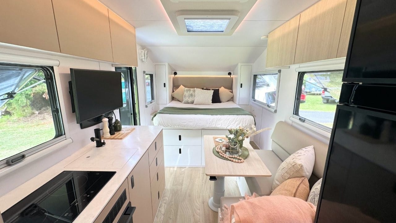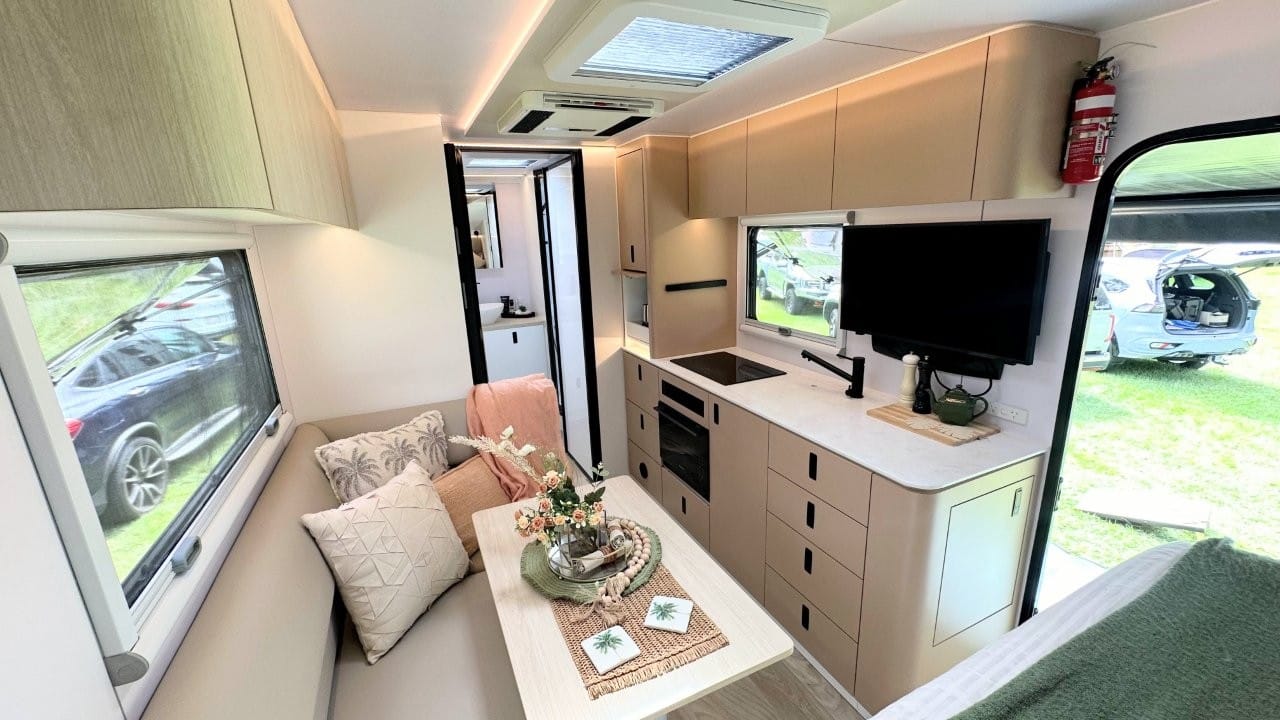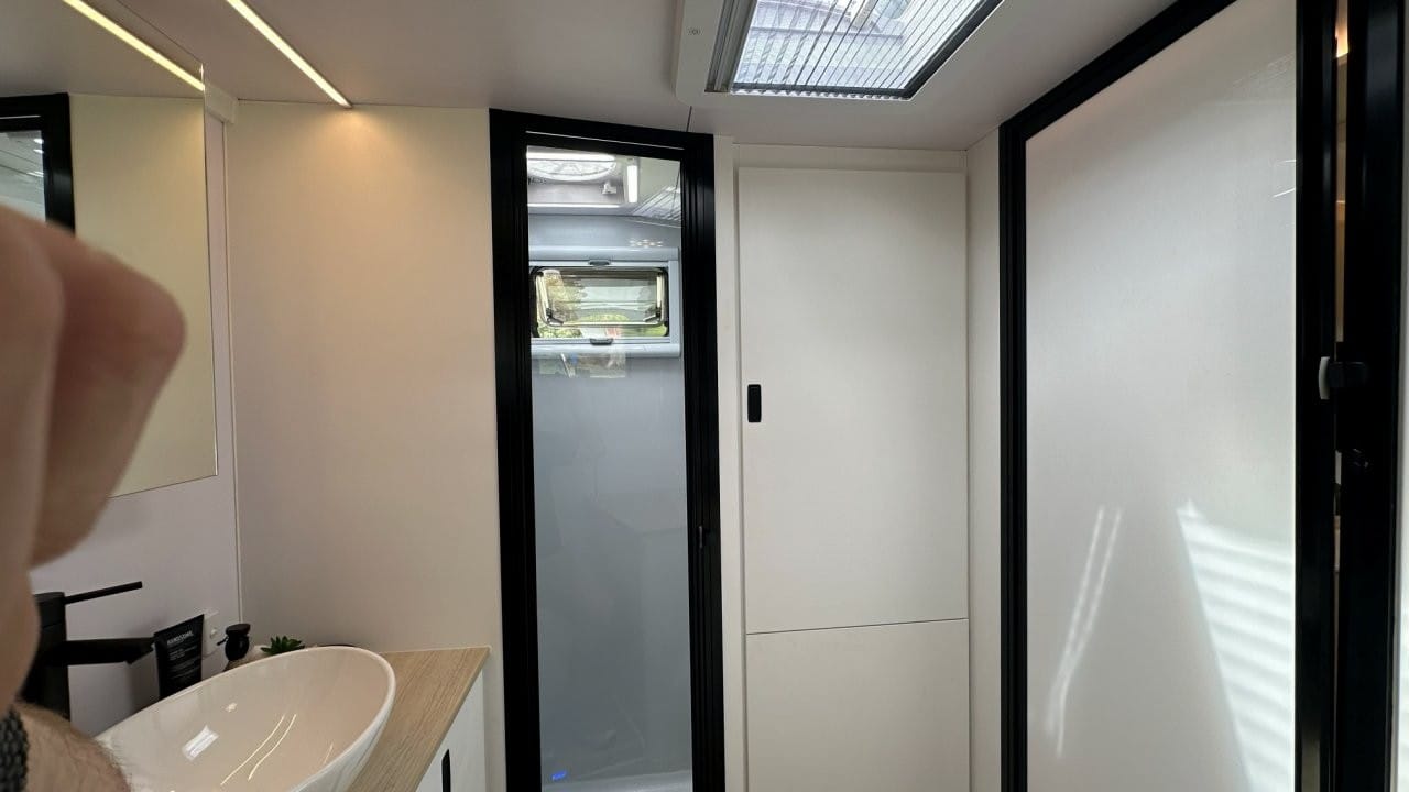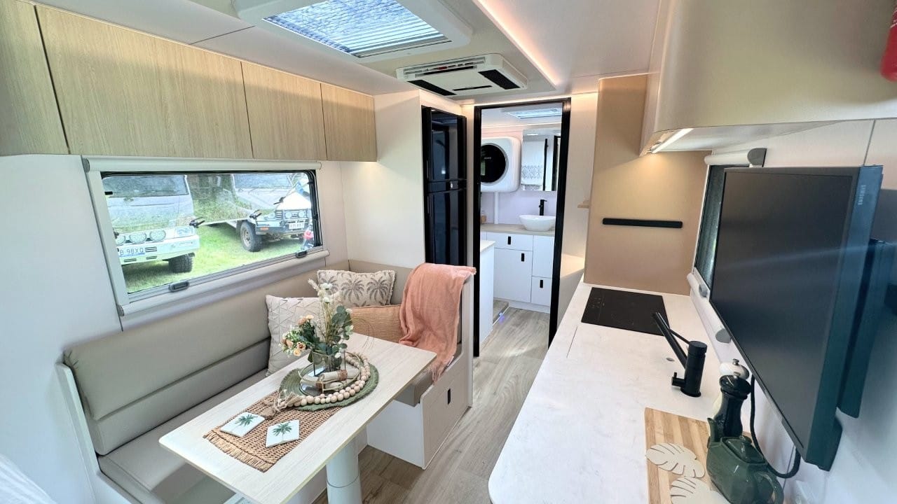 This van has an island bed layout at the front, L shape dining and kitchen in the middle with full height fridge and pantry, huge separate shower and toilet at the rear of the van. Complete with 628ah Premium Lithium battery system, 1540W solar panels, 224L full height compressor fridge, diesel heater.