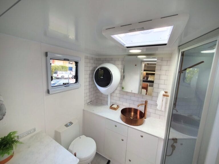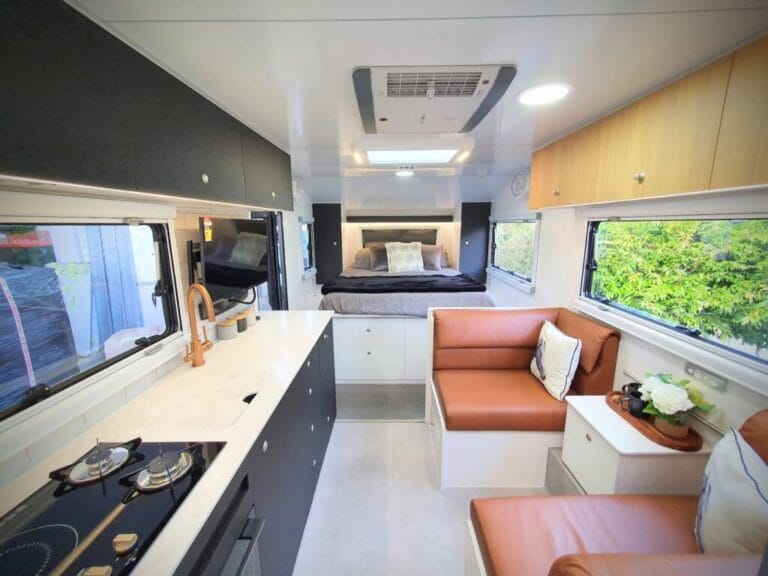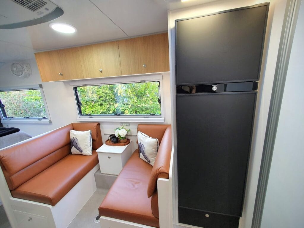 This van has an island bed layout at the front, café dining and kitchen in the middle with full height pantry, huge separate shower and toilet at the rear of the van. Complete with 600ah Enerdrive pro series Lithium system, 1080W solar panels, 224L full height compressor fridge, diesel heater, military load sharing independent suspension.